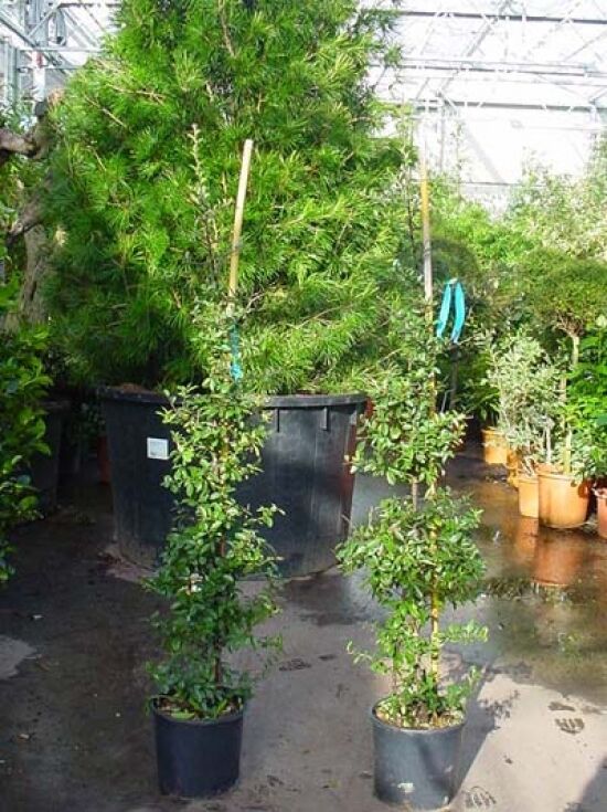 | Blatt: | Immergrün, eiförmig bis lanzettlich, dunkelgrün glänzend, ledrig bis zu 3,5-4 cm lang. |