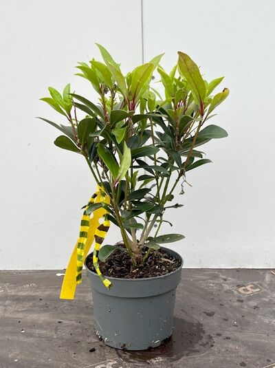 | Blatt: | Immergrün, elliptisch, am Ende zugespitzt, dunkelgrün glänzend, rot gefärbte Adern, 6 bis 12 cm lang. |