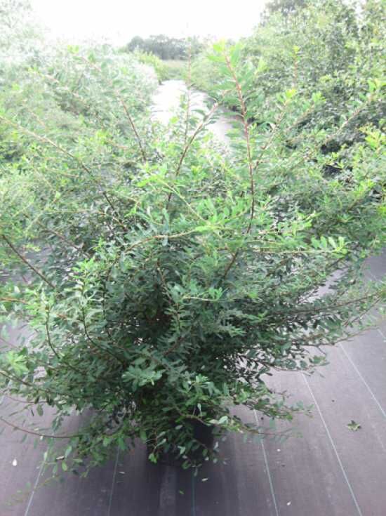 Wuchs: Kleiner bis mittelgroßer Strauch, vieltriebig und breit aufrecht, dichtbuschig und kompakt, bogig überhängende Zweige, bis zu 2 m hoch und bis zu 4 m breit.