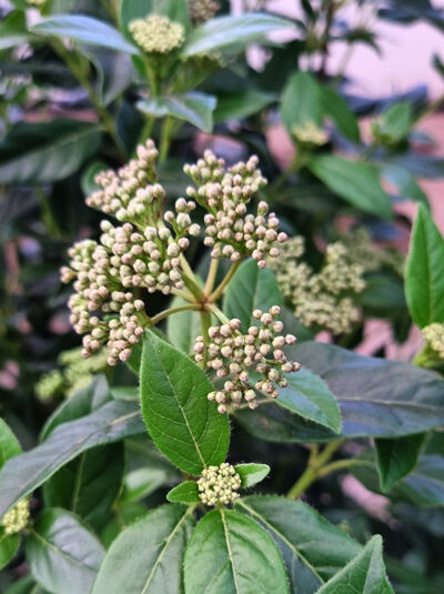 Name Botanisch: Viburnum tinus 'Eve Price'.