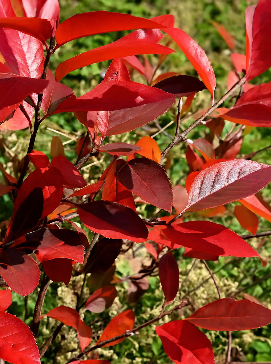 Aronia melanocarpa (Schwarzfrüchtige Apfelbeere) – Zweige mit leuchtend roten Herbstblättern in Nahaufnahme.
