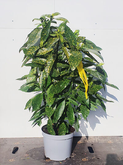 Japanische Aukube 'Variegata' (Aucuba japonica 'Variegata') im Topf, 60–80 cm, grüne Blätter mit gelber Sprenkelung.