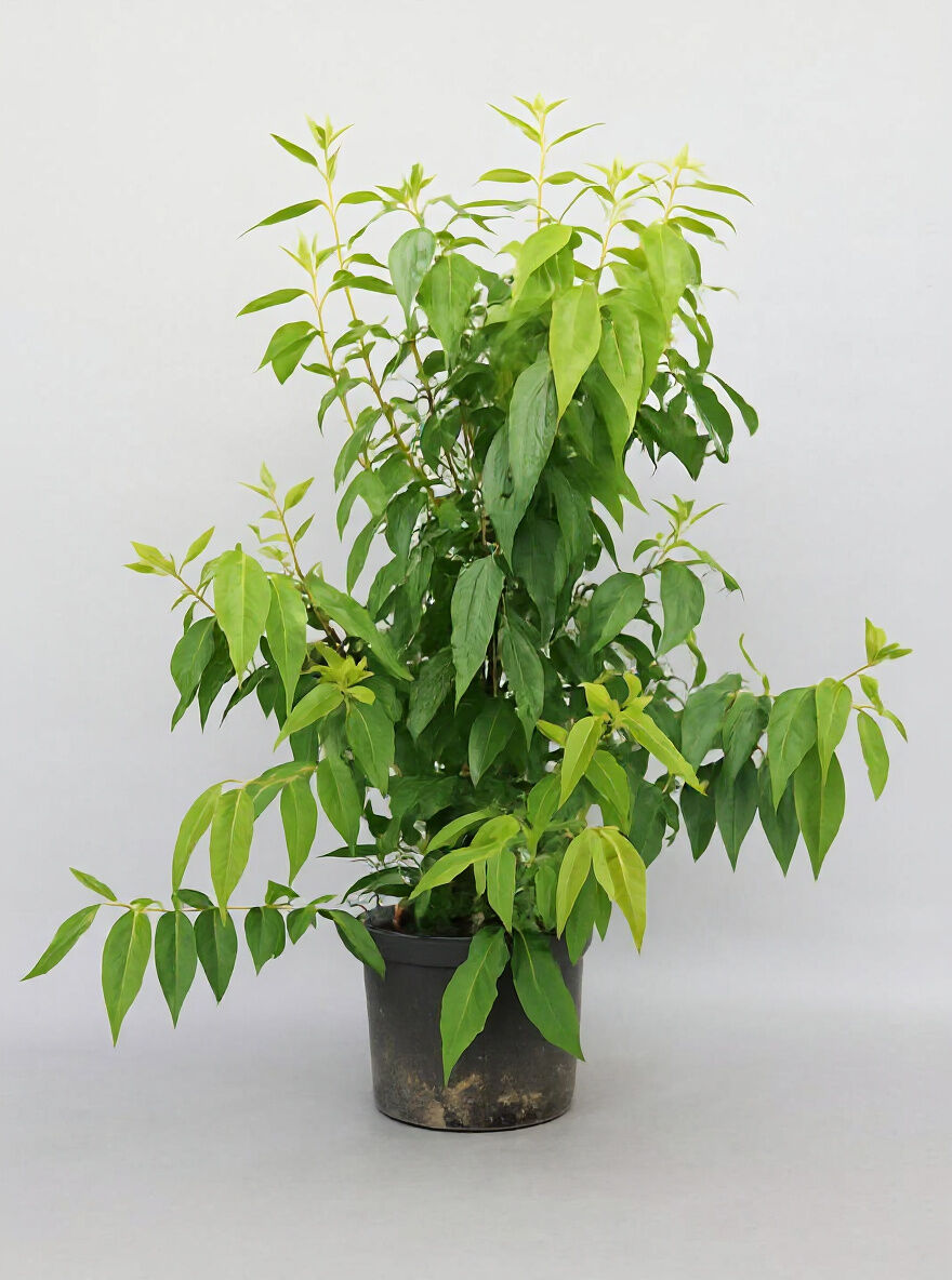 Chinesische Winterblüte (Chimonanthus praecox) als belaubter Strauch im Pflanzcontainer in der Baumschule.