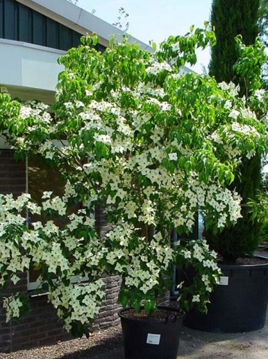Chinesischer Blumen-Hartriegel Cornus kousa var. chinensis 'China Girl' als Kübelpflanze mit weißen Blüten und grünem Laub