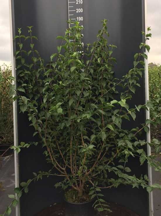Wuchs: Großer Strauch, anfangs aufrecht, wenig verzweigt, später breit-ausladende Krone mit überhängenden Seitenästen, 4 bis 7 m hoch und genauso breit