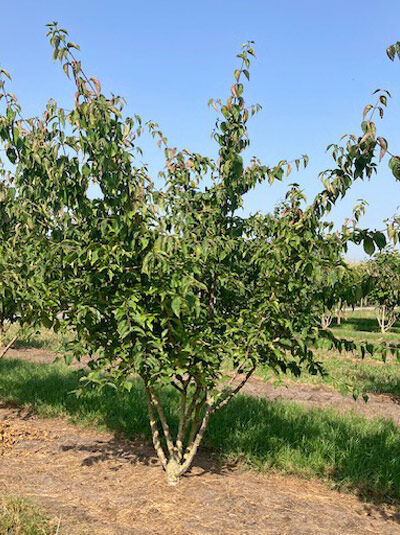 Cornus mas (Kornelkirsche) als mehrstämmiger Strauch mit aufrechten Trieben und grünem Laub im Feldanbau.