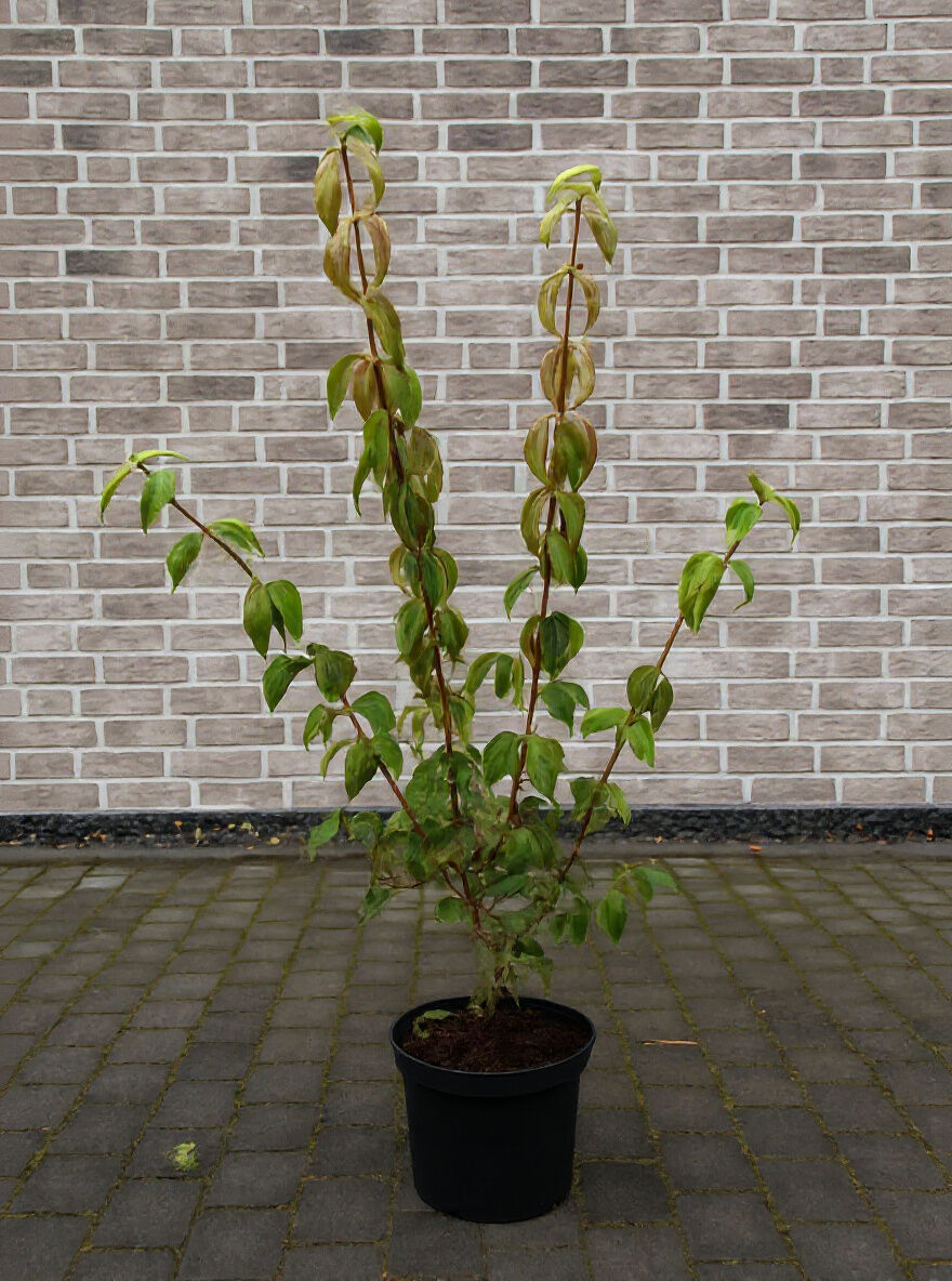 Cornus mas (Kornelkirsche) als buschiger Strauch im Topf mit dichtem, grünem Laub und zahlreichen Zweigen