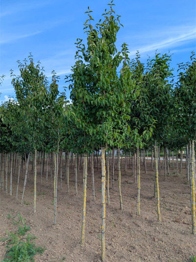 Cornus mas (Kornelkirsche) Hochstamm 10-12 StU mit Drahtballen, junger Laubbaum im Baumschulfeld mit aufrechtem Wuchs.