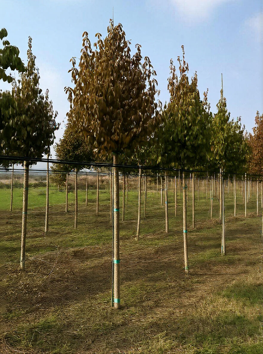 Cornus mas (Kornelkirsche) Hochstamm 12–14 StU mit Drahtballierung, Baumreihe in der Baumschule mit Laubkrone