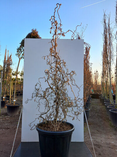 Corylus avellana 'Contorta' / Korkenzieher-Hasel 'Contorta' 200-250 cm C80, im Container mit gedrehten, kahlen Zweigen.