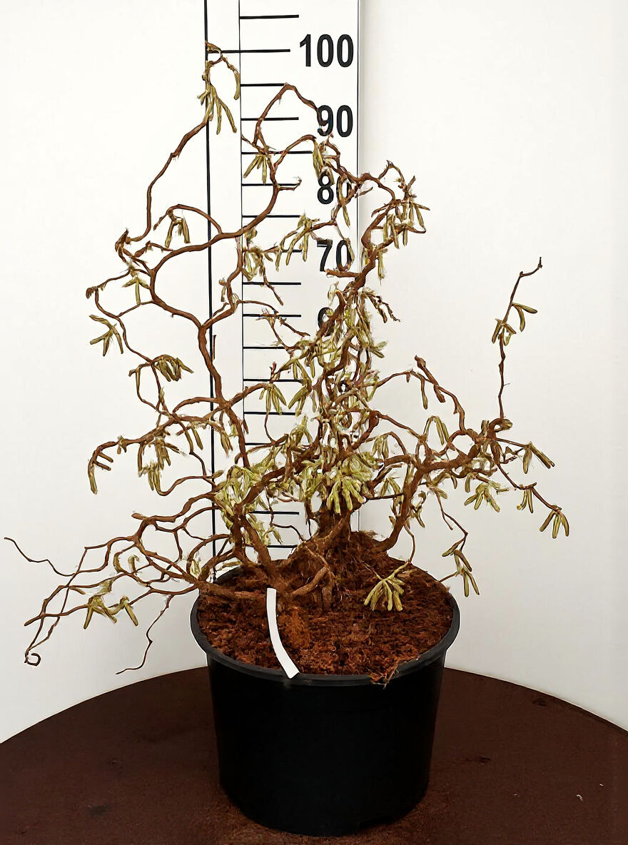 Korkenzieher-Hasel 'Contorta' (Corylus avellana 'Contorta') 80-100 cm im C20-Topf, Strauch mit gedrehten Trieben und Kätzchen.