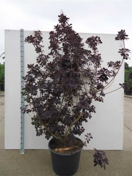 Cotinus coggygria 'Royal Purple' / Roter Perückenstrauch 'Royal Purple' im großen Pflanzcontainer, mehrstämmig mit purpurfarbenem Laub.