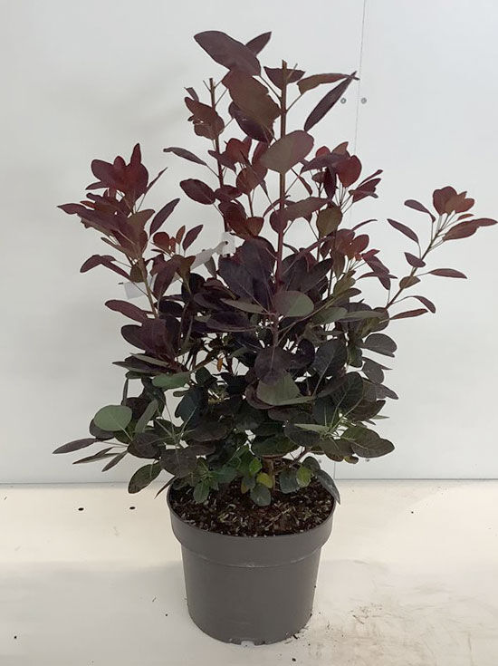 Cotinus coggygria 'Royal Purple' / Roter Perückenstrauch 'Royal Purple' im Topf, mehrstämmiger Strauch mit dunkelpurpurnen Blättern.