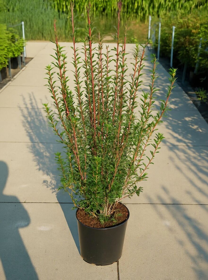Wuchs: Mittelgroßer Strauch, schlank aufrecht, quirlständig angeordnete Zweigetagen, im Alter lockerer und breiter, 2,5 bis 4 m hoch und bis zu 3 m breit.