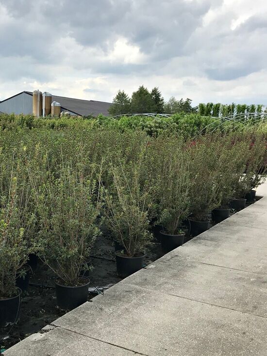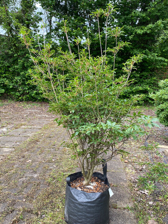 Enkianthus campanulatus (Glockige Prachtglocke) mehrstämmiger Strauch im Pflanzsack mit aufrechtem Wuchs und grünen Blättern.