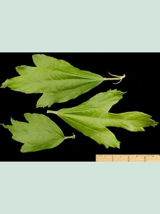 | Blatt: | Sommergrün, eiförmig, dreilappig, gezahnter Rand, Austrieb gelb-weiß, dann mittelgrün, Herbstfärbung gelb, 6 bis 10 cm lang. |