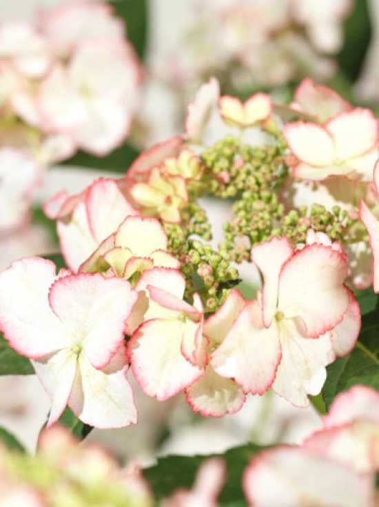 Die Hydrangea macrophylla 'Love you Kiss ®' (Teller-Hortensie 'Love you Kiss') erweist sich ebenso als gut frosthart. Die weißen Blüten, die einen roten Rand besitzen, sind das besondere Highlight...