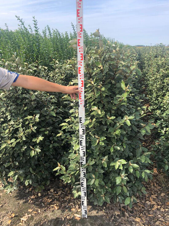 Elaeagnus ebbingei (Wintergrüne Ölweide) 125–150 cm m. B., dicht verzweigter Strauch mit ovalen, grün-silbrigen Blättern neben Messlatte
