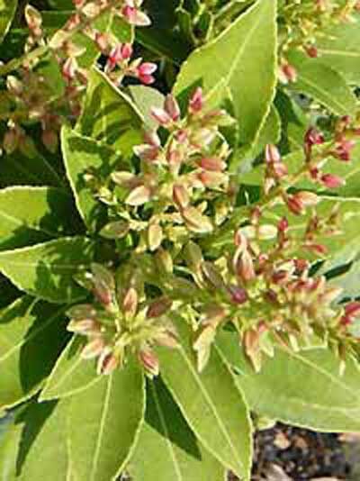 | Blatt: | Immergrün, länglich, am Ende zugespitzt, im Austrieb orangerosa, dann sattgrün glänzend, 4 bis 8 cm lang |