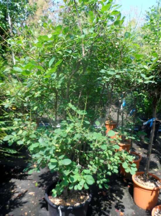 Cotinus coggygria 'Young Lady®', Perückenstrauch 'Young Lady' mit grünen, rundlichen Blättern und Perückenblütenständen im Topf.