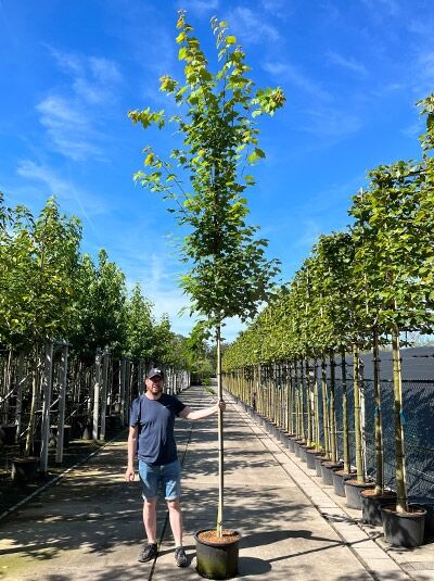 | Detaillierte Beschreibung: | Herkunft und Besonderheiten des Acer rubrum ’ Scanlon‘ / Rot-Ahorn ’Scanlon‘Der Acer rubrum ’Scanlon‘ trägt seinen Beinamen zu Ehren der gleichnamigen Baumschule E.H. Scanlon, die ihn im Jahr 1955 auf dem Markt brachte. Dieser wunderschöne Rot-Ahorn zeichnet sich durch seine dichtverzweigte und schmal-kegelförmig wachsende Baumkrone aus. Er bleibt eher klein und eignet sich aufgrund seines Habitus bestens für die Pflanzung auf beengtem Raum. Die wunderschöne Wuchslinie im Zusammenspiel mit einer atemberaubenden Herbstfärbung machen diese Selektion zu einem wertvollen und beliebten Solitärgewächs in den Gärten Europas. Acer rubrum stammt ursprünglich aus den USADer Urtyp Acer rubrum ist vor allem unter seinem deutschen Namen Rot-Ahorn oder auch Scharlach-Ahorn bekannt. Er gehört zur großen Familie der Seifenbaumgewächse und stammt ursprünglich aus den gemäßigten Zonen des östlichen Nordamerikas. In seiner Heimat findet man ihn auf feuchten frischen BödenDort trifft man den Acer rubrum bevorzugt auf feuchtfrischen Böden wie zum Beispiel in Sümpfen oder an Flussufern. Er ist daher ebenso unter dem Trivialnamen Sumpf-Ahorn bekannt. Robuster Baum mit spektakulärer HerbstfärbungDer Acer rubrum / Rot-Ahorn gilt generell als sehr robust und frostresistent, was ihm in Europa große Bewunderung verschafft. Neben seinem pflegeleichten Charakter überzeugt er insbesondre durch seine intensiv-rötliche Laubfärbung, die entsprechend der jeweiligen Selektion individuell ausfällt. In seiner Heimat den USA gilt er als Hauptdarsteller des bekannten Indian Summer und bezaubert dort mit seiner prächtigen Ausstrahlung. Kleiner Baum mit schmalem Wuchs bietet viele MöglichkeitenAcer rubrum ‘Scanlon‘ bleibt im Vergleich zu vielen seiner Verwandten eher klein und erreicht eine ungefähre Endhöhe von bis zu 10 Metern. Da seine Wuchslinie vergleichsweise schmal ausfällt benötigt die ausgewachsene Baumkrone nur ein Platzangebot von circa 4 Metern und eröffnet dem Gärtner damit ein breites Verwendungsspektrum. Acer rubrum ’Scanlon‘ kann entsprechend auf kleinerem Raum die Ausstrahlung eines prächtigen Baums vermitteln und erfreut mit seiner wunderschönen Optik. Aufrechter Stamm mit schmalkroniger BaumkroneBesonders gerade und aufrecht wächst der Stamm der Selektion und verleiht dem Baum damit einen aristokratischen Charme. Die Baumkrone setzt niedrig am Stamm an und entwickelt sich dicht verzweigt und schmal säulenartig. Dies betont die schlanke und edle Ausstrahlung und macht den Acer rubrum ’Scanlon‘ zu einem anmutigen Gartenelement. Sehenswerter Stamm trägt auffallend graue RindeNeben seinem aufrechten, geraden Wuchs überzeugt der Stamm der Selektion mit.... |
