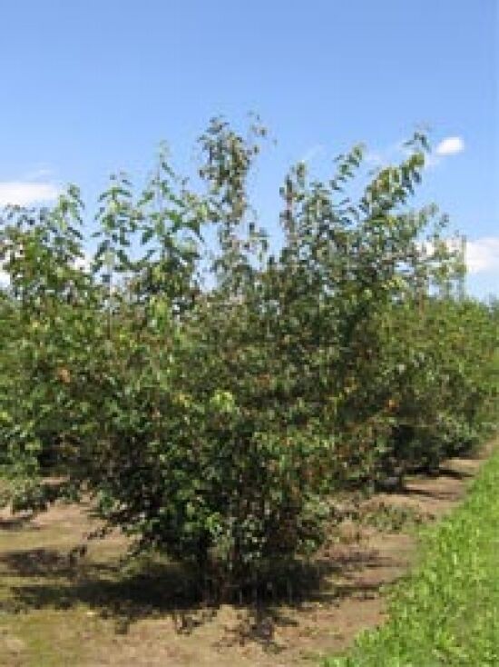 Wuchs: | Großer Strauch bis kleiner Baum, locker aufrecht, breit rundliche Form, fächerförmige Krone, überhängende Hauptäste, dünne Zweige, mehrstämmig, bis zu 7 m hoch und 8 m breit |