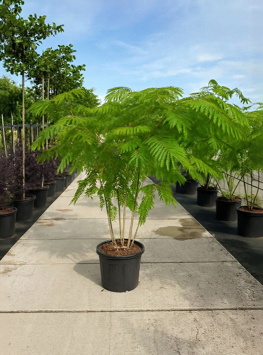 Seidenbaum Albizia julibrissin 'Ombrella'/'Boubri', mehrstämmig im C50-Topf, 200–250 cm, mit gefiedertem Laub.
