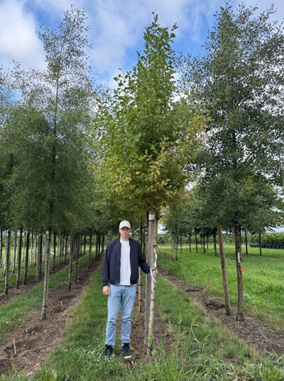 Gold-Erle (Alnus incana 'Aurea') als junger Baum im Feldanbau, aufrechter Wuchs mit gelbgrünem Laub.