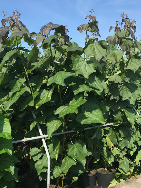 Blut-Trompetenbaum (Catalpa erubescens 'Purpurea') als Jungbaum mit aufrechtem Stamm und dichtem Blattwerk in der Baumschule