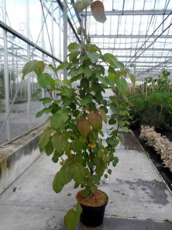 Davidia involucrata (Taschentuchbaum) als junger Baum im Topf mit grünem Laub, aufrecht wachsend am Stützpfahl.