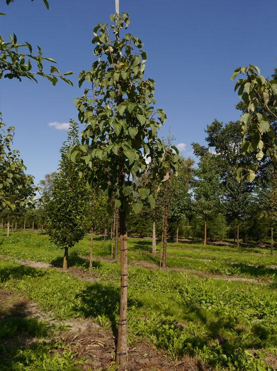 Davidia involucrata Taschentuchbaum Hochstamm 16-18 StU, junger Baum mit Stützpfahl und grünem Laub im Feldbestand