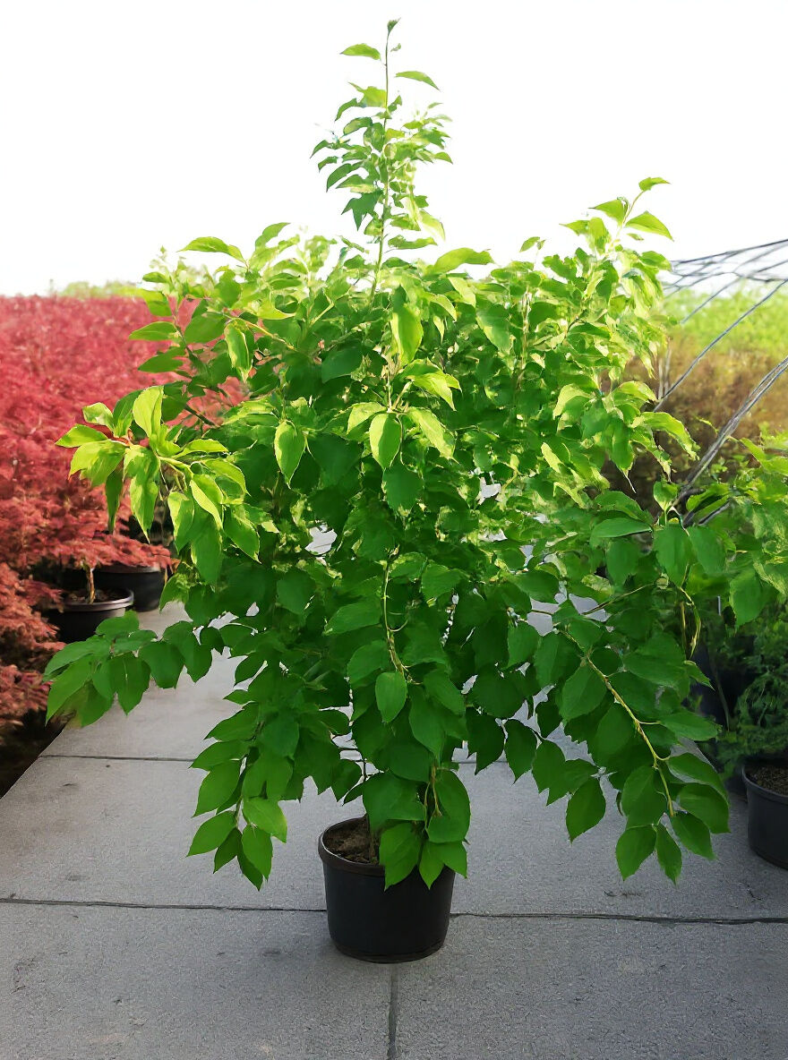 Halesia carolina (Schneeglöckchenbaum) als mehrstämmiger Strauch im schwarzen Pflanztopf, mit dünnen Trieben und grünen Blättern.