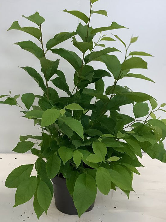 Halesia carolina (Schneeglöckchenbaum) als mehrstämmiger Strauch im schwarzen Pflanztopf, mit dünnen Trieben und grünen Blättern.