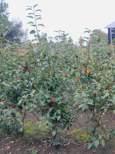 | Frucht: | Orangerote bis kräftig rote Zieräpfel, 2 bis 3 cm dick |