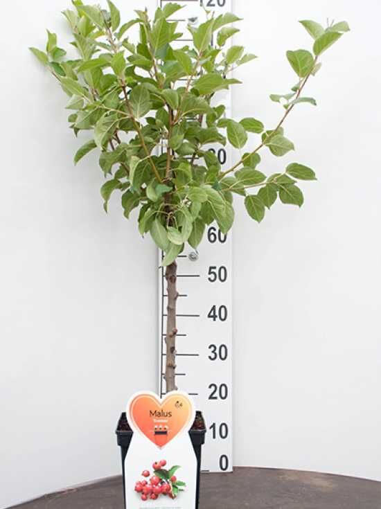 Malus 'Evereste' / Zierapfel 'Evereste', 50 cm Stamm C7, junger Hochstamm mit grünem Laub im Container.