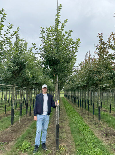 Malus 'Evereste' / Zierapfel 'Evereste' in Baumschule, Reihe junger Bäume mit grünem Laub am Stützsystem