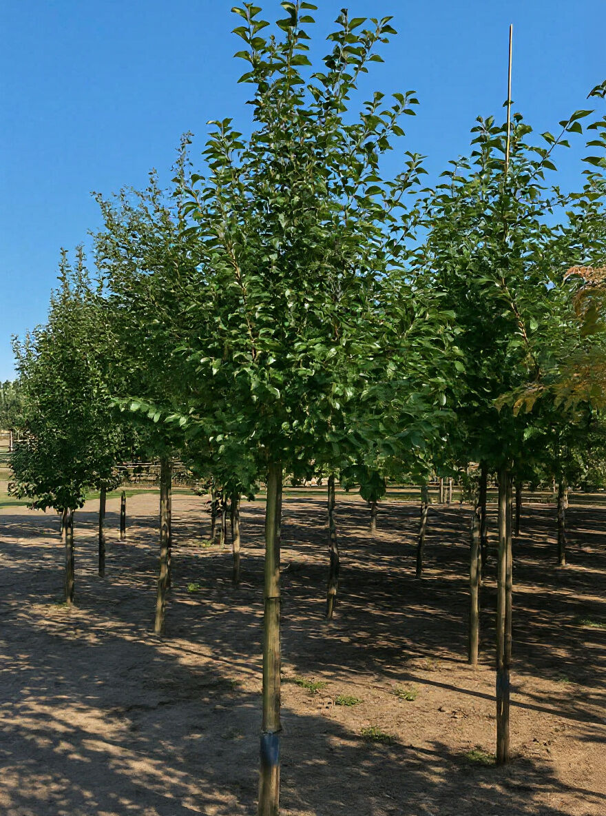 Malus 'Evereste' / Zierapfel 'Evereste', Jungbäume in Baumschulreihe mit aufrechtem Stamm und dichtem grünem Laub.
