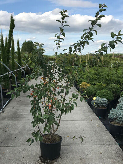 | Wuchs: | Großer Strauch oder kleiner Baum, kegelförmige bis breit aufrechte Krone, später ausladend mit überhängenden Seitenästen, 5 bis 8 m hoch und 4 bis 5 m breit. |