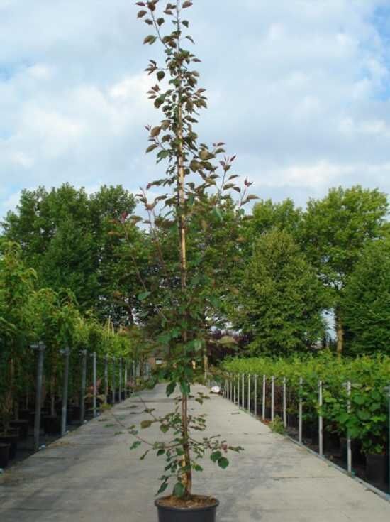 Blatt: | Sommergrün, oval, am Ende zugespitzt, gezahnter Rand, im Austrieb braunrot, dann dunkelgrün mit braunem Schimmer, bis zu 10 cm lang. |