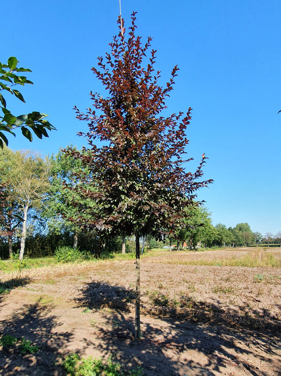 | Blatt: | Sommergrün, spitz-eiförmig bis oval, gezahnter Rand, dunkelrot, später dunkelgrün, Herbstfärbung orangerot, ca. 6 cm lang. |