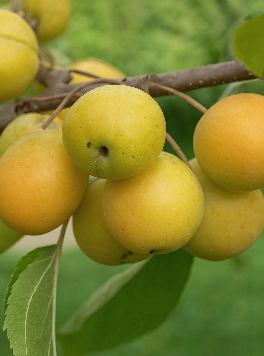Malus tschonoskii (Wollapfel) mit gelben, runden Früchten am Zweig und grünen Blättern.