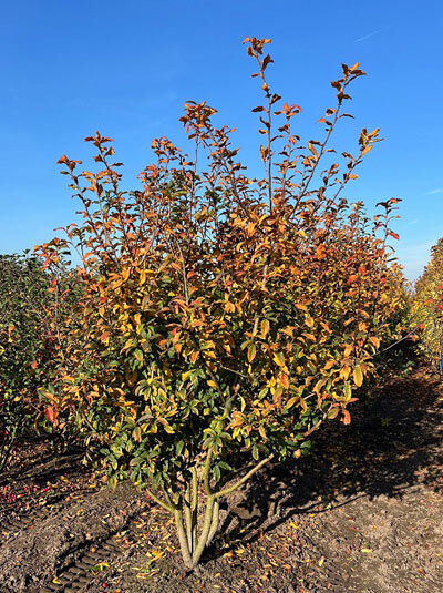 Mespilus germanica 'Westerveld' / Deutsche Mispel 'Westerveld', mehrstämmiger Strauch mit dichtem Laub und Herbstfärbung im Feldanbau