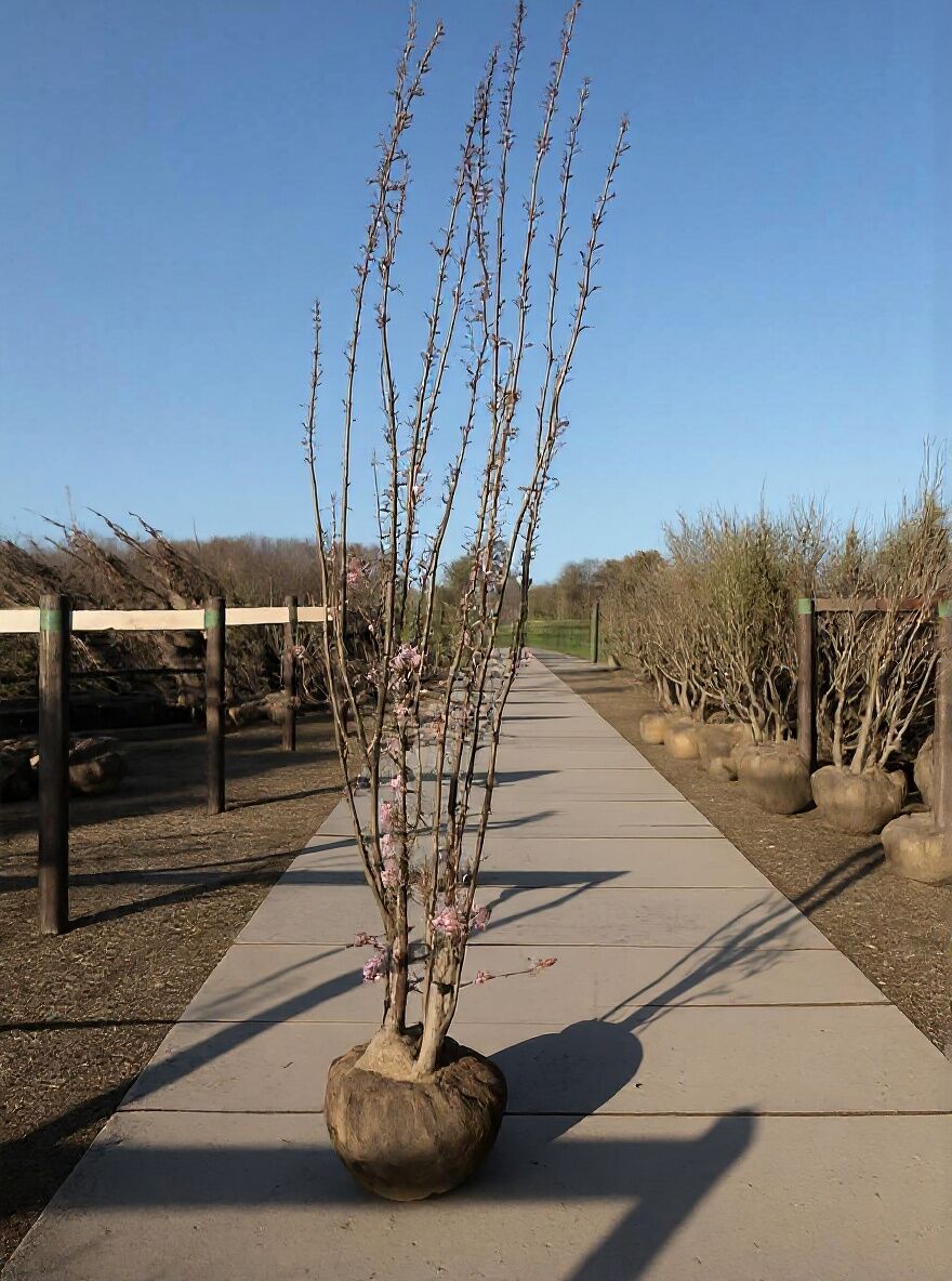 Prunus sargentii ’Rancho‘ gehört zur Familie der Rosengewächse und entwickelt sich mit einem mittelstarken Jahreszuwachs. Nach einigen Jahren erreicht der kleine Baum oder Großstrauch seine Endhöhe von 6 bis 8 Metern und liefert dem Betrachter einen wunderschönen Anblick. Die formschöne Baumkrone bleibt im Vergleich zu anderen Züchtungen deutlich schmaler. Senkrecht ansetzende Hauptäste streben säulenartig in die Höhe und präsentieren im Alter eine schmale bis schmal-trichterförmige Krone. Mit einer ungefähren Breite von 3 bis 4 Metern ist diese Züchtung ideal für die Verwendung auf beengtem Raum und bietet jedem Gärtner die Chance, sich an der malerischen Schönheit zu erfreuen.