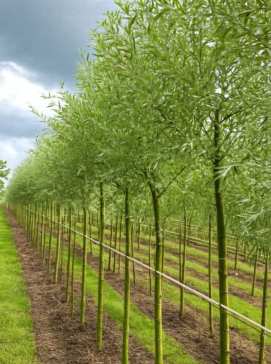 Salix alba 'Sericea' (Seiden-Silber-Weide), Hochstamm 14-16 StU, Reihe junger Bäume mit silbrig-grünem Laub