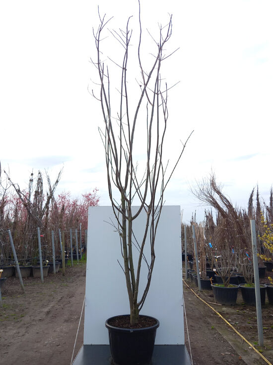 Tetradium daniellii (Euodia hupehensis), Samthaarige Stinkesche/Bienenbaum im Topf, Hochstamm mit kahlen Ästen.
