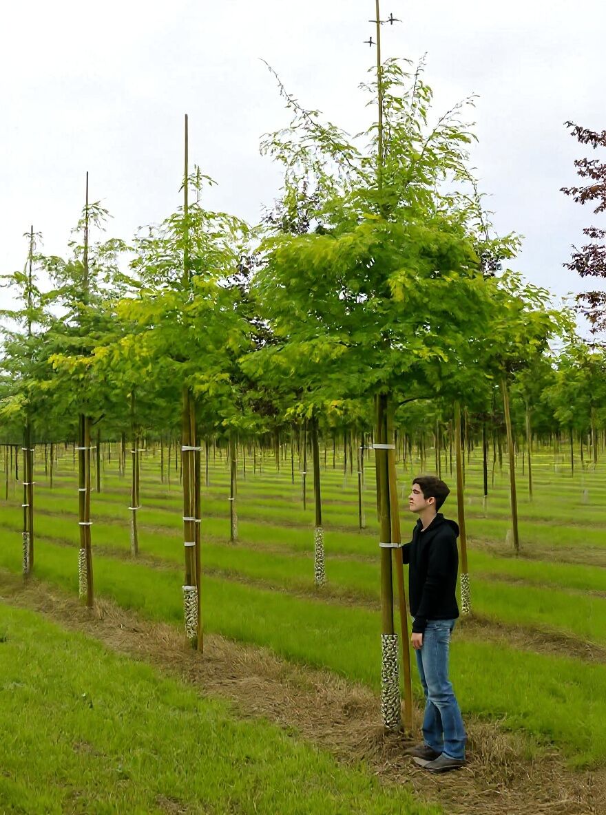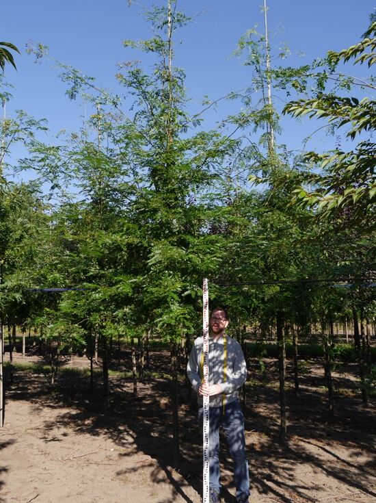 Der Dornenlose Lederhülsenbaum beeindruckt mit einem rasanten Wachstum und weist bereits nach wenigen Jahren eine beeindruckende Endhöhe von circa 20 Metern und eine Breite von 10 Metern auf. Die zerklüftet wirkenden Äste entwickeln sich horizontal abstehend und bilden die unregelmäßige luftige Baumkrone.