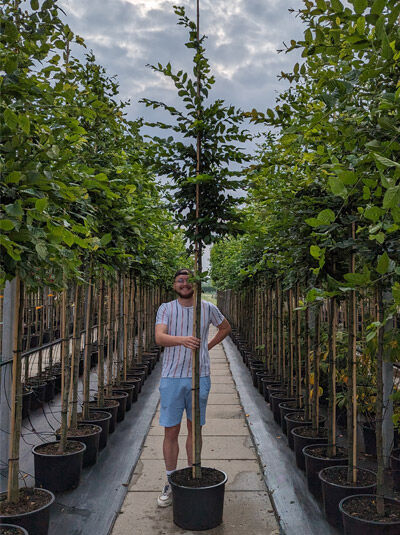 Carpinus betulus (Hainbuche/Weißbuche) als Hochstamm mit geradem Stamm und dichtem, grünem Laub in der Baumschule.