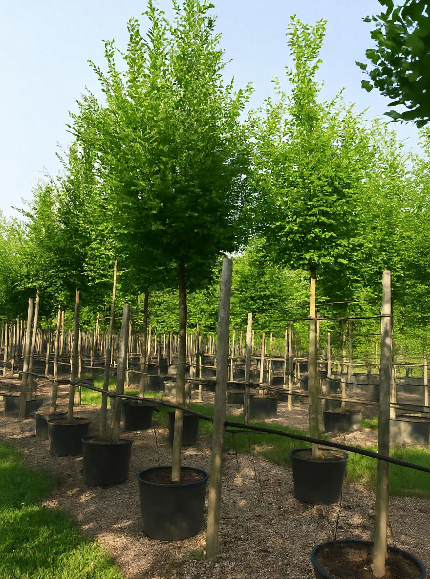 Carpinus betulus (Hainbuche/Weißbuche) als Hochstamm mit geradem Stamm und dichtem, grünem Laub in der Baumschule.