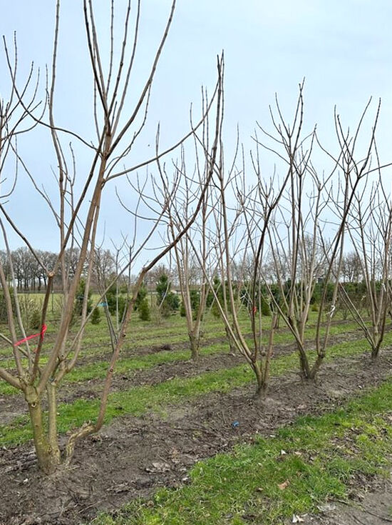 Catalpa bignonioides (Trompetenbaum) als mehrstämmiger, laubloser Jungbaum im Topf in der Baumschule.
