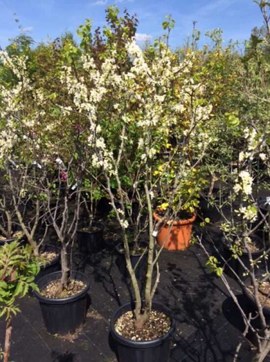 Im Kontrast zu der reinweißen Blüte steht der aparte Stamm der Selektion: Die Triebe entwickeln sich zunächst in einem Rotbraun, um dann immer dunkler und fast schwarz zu werden. Dann hebt sich die weiße Blüte markant von der dunklen, gefurchten Stammstruktur ab und lässt interessante Kontraste entstehen.